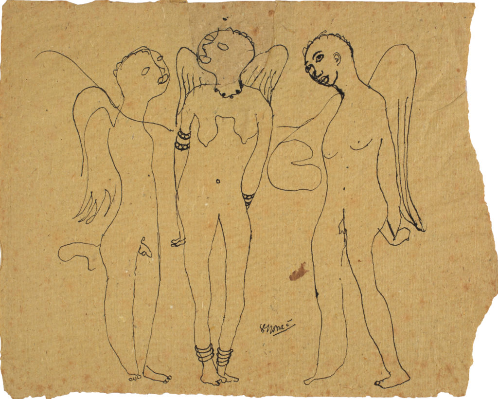 Les hommes chez lui sont sages et barbus, les femmes plantureuses et épanouies, felliniennes. Augustes bergers et Vénus paysannes se croisent d’ailleurs rarement dans sa peinture. Sinon parfois du regard, arrêtés comme en chiens de faïence, le cheveu hérissé, l’air intrigué, se soufflant leur commune stupéfaction au visage, à quelques centimètres seulement l’un de l’autre. Mais la plupart du temps, Kopac ne figure ni des hommes, ni des femmes, plutôt des angelots aux cheveux bouclés et à la lèvre gourmande. A l’image sans doute de tous ces anges baroques qui ont jailli comme de beaux diables sur les autels des églises de Croatie, au XVIIe et au XVIIIe siècle – et qui ont tant surpris le photographe japonais Keiichi Tahara lorsqu’il les a découverts, au début de la guerre, à Sainte-Marie-des-Neiges à Bélec, au couvent franciscain de Varazdin ou à l’église paulinienne Saint-Jérôme de Strigova… Pas de ces anges aristocratiques, maniérés et bien élevés comme on se les imagine à la cour de Vienne ou dans les chapelles privées de Venise. Non, des anges rustiques, aux grands yeux dévoreurs qui ne veulent pas en perdre une miette, et aux joues toutes rouges et rebondies à cause du froid. Des anges bouffis de santé, qui répriment une sacré bon dieu envie de rire.