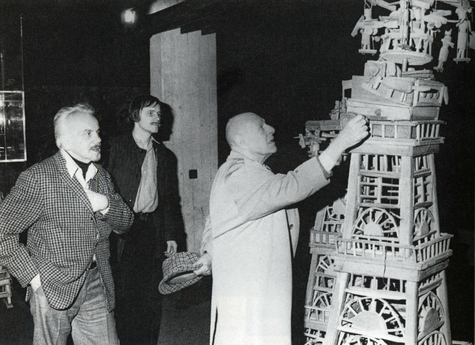 Slavko Kopac, Michel Thévoz et Jean Dubuffet à l'ouverture de la Collection de l'Art Brut, février 1976