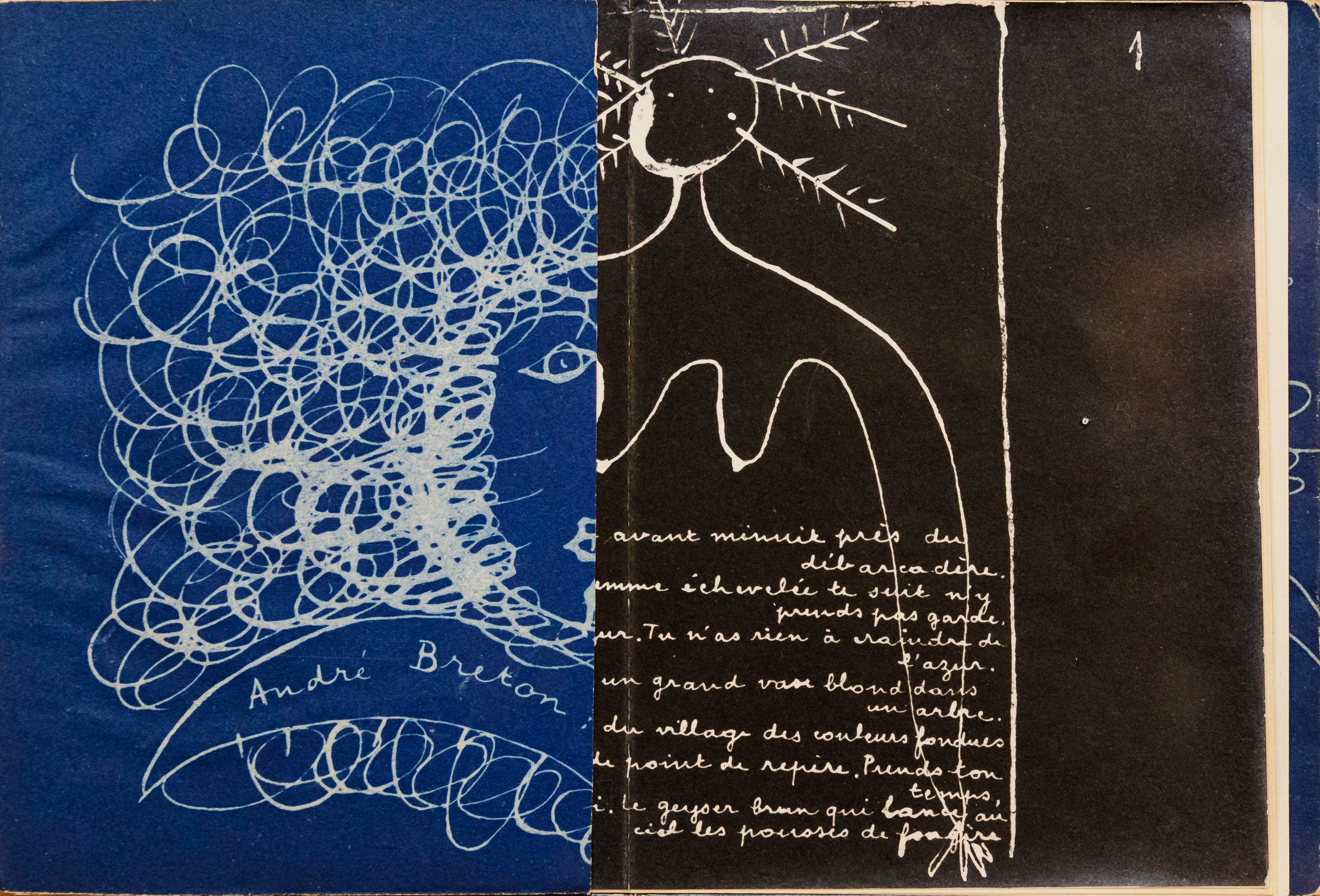 In 1954, Slavko Kopac and André Breton together created a poem-object that bears witness to the friendship and artistic rap port they had developed five years earlier. Their collaboration had begun in 1949, during Kopac’s first Parisian exhibition at the Galerie Messages, for which they produced a limited-edition calligraphed booklet. This booklet combined a handwrit ten poem by Breton, ‘Au regard des divinités’ (‘In the Eyes of the Gods’, composed in 1923), with drawings by Kopac. The 1954 poem-object can be seen as a transposition onto wood of that earlier work originally created on paper. It reprises the same poem, copied out in Breton’s own hand, along with variations of Kopac’s drawn motifs: ‘While I was making the drawings and showing him what the page layout could look like, he was doing the writing, and we ended up signing it together. It was a brilliant moment’, Kopac later reminisced.